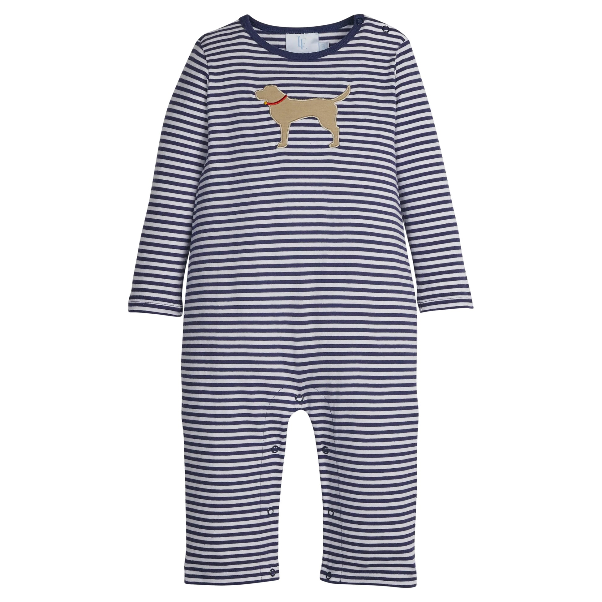 Little English labs are favorites year after year, and our FaLaLa Labradors are no different with this traditional combination of navy & red. Our Applique Romper - Lab is a classic, long sleeve and long leg knit style on navy and white stripes. The center chest features an adorable applique lab in a festive red collar. Fun and comfortable, your little lab lover can play all day, and siblings can coordinate in these sweet styles.