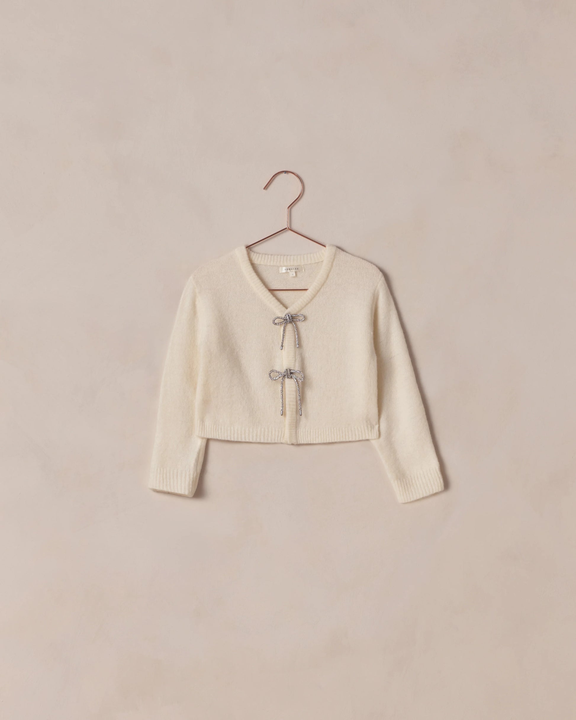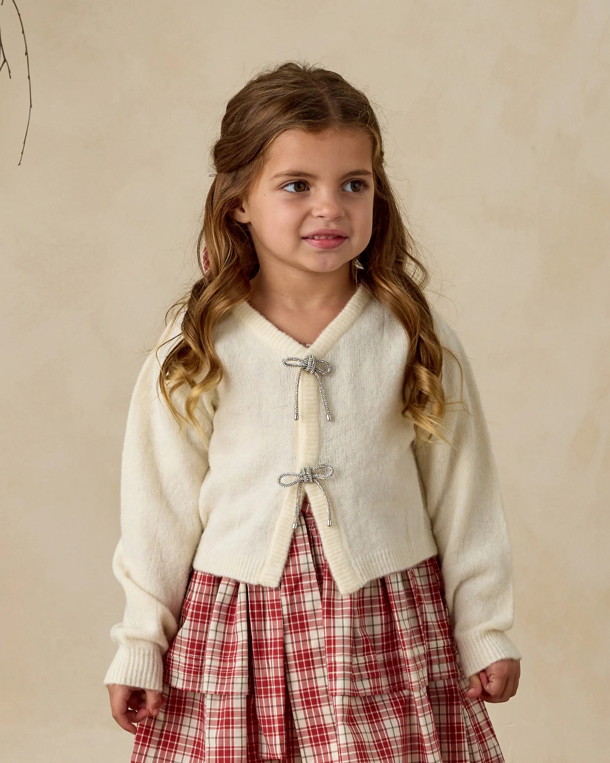 The Bow Cardigan is a sweet layering piece featuring a classic knit body with delicate bow details down the front. Designed for both comfort and charm, it pairs beautifully with holiday dresses or can be worn as a cozy statement piece on its own.