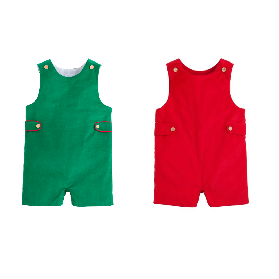 - Button closures at shoulders, snaps at stride