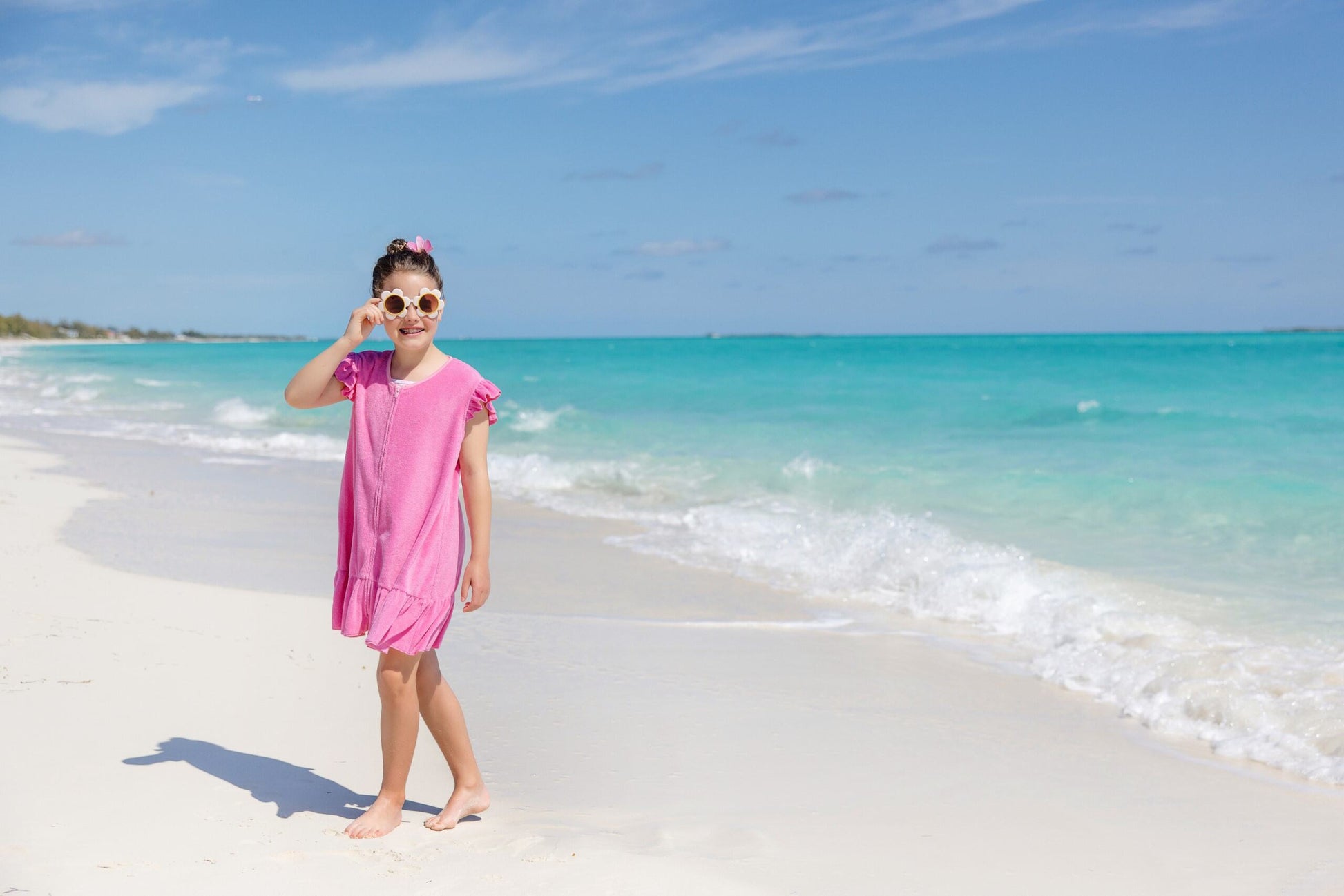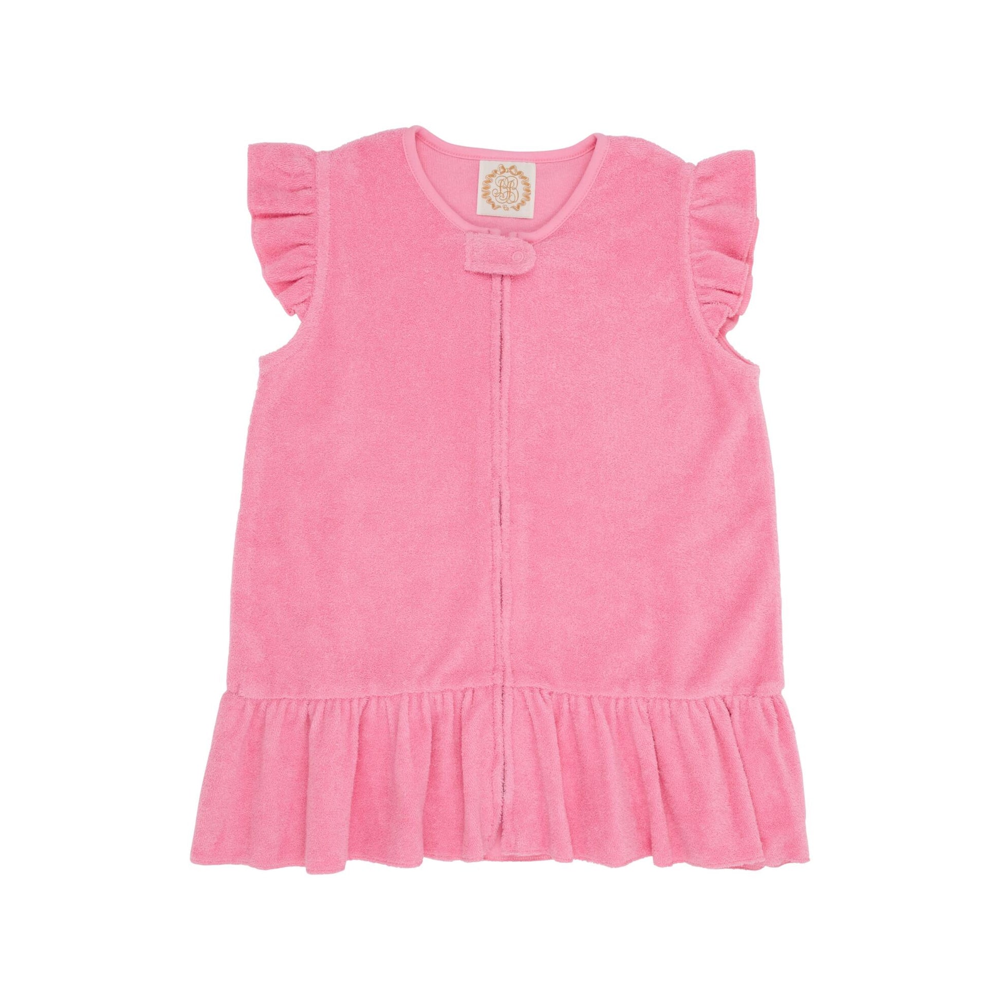 The Camille Cover Up in Worth Avenue White features a Hamptons Hot Pink trim and flower appliqué, making it the perfect poolside essential for your little one. This cover-up slips on easily over swimwear, providing extra sun protection and style for beach days and pool parties!