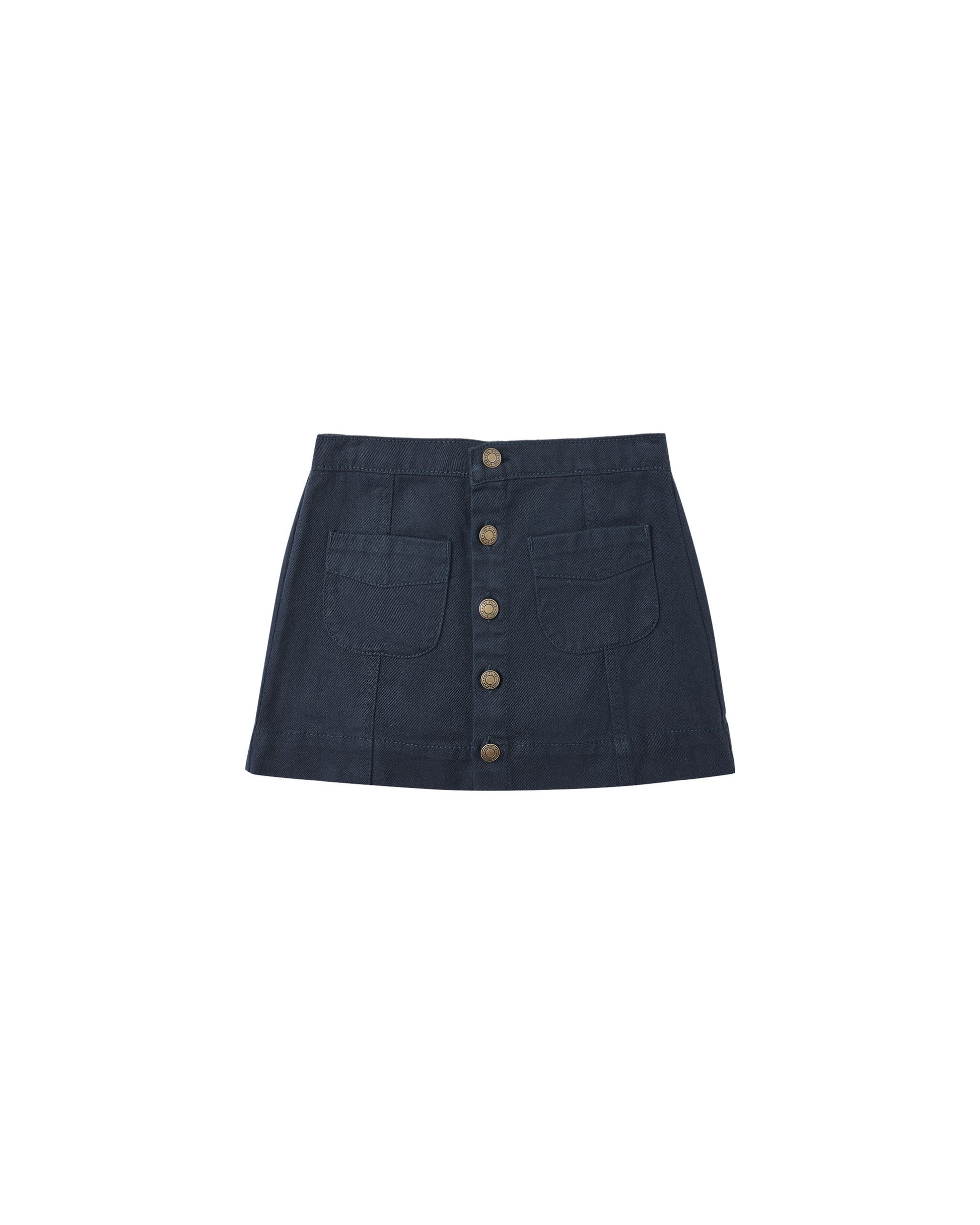 This versatile piece offers washed black denim for a cool look, accented with antique brass buttons and handy front pockets.