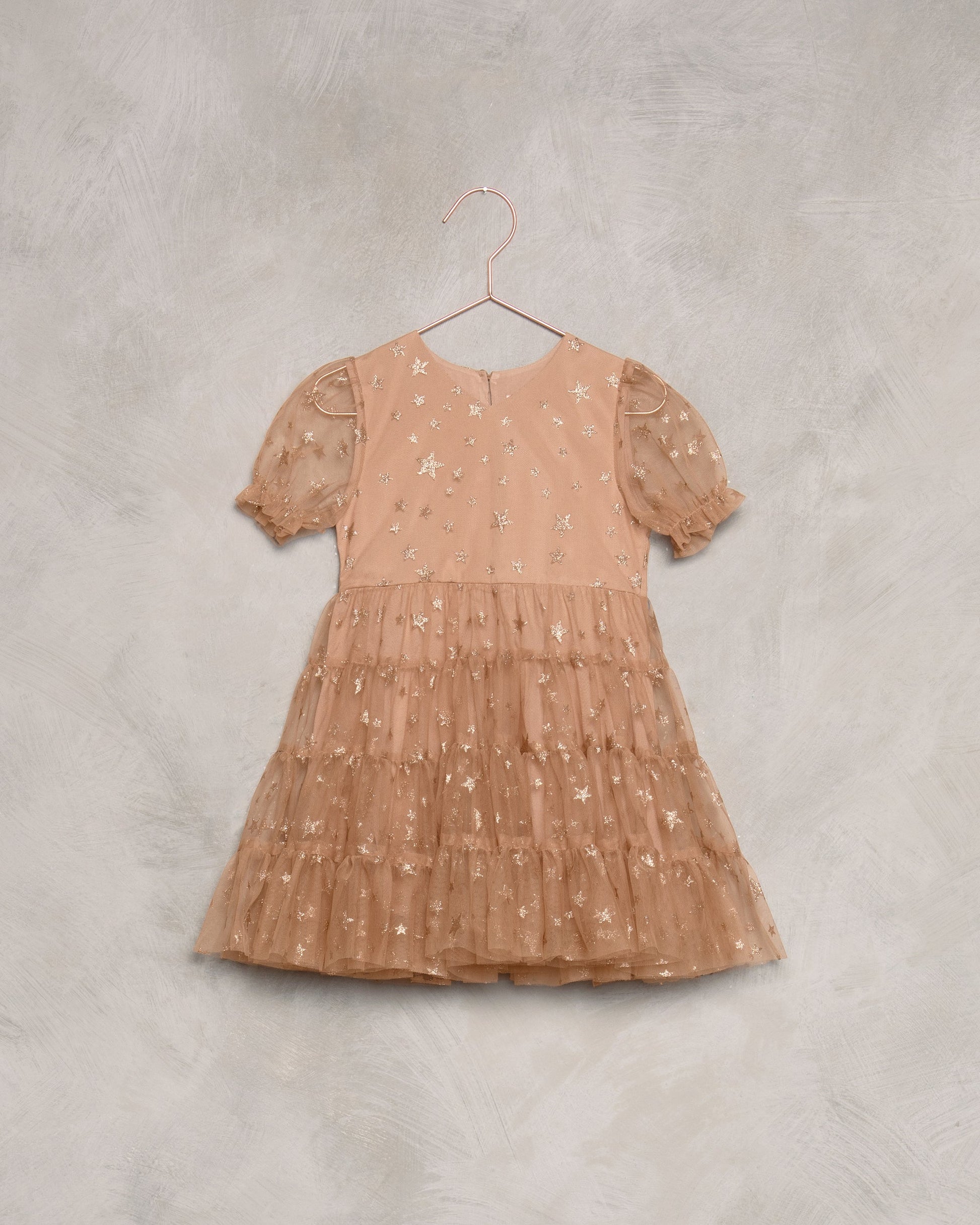 This dreamy, midi-length dress is made up of flocked tulle featuring a layered skirt, full puffed sleeves, and a delicate button back closure, perfect for twirls.