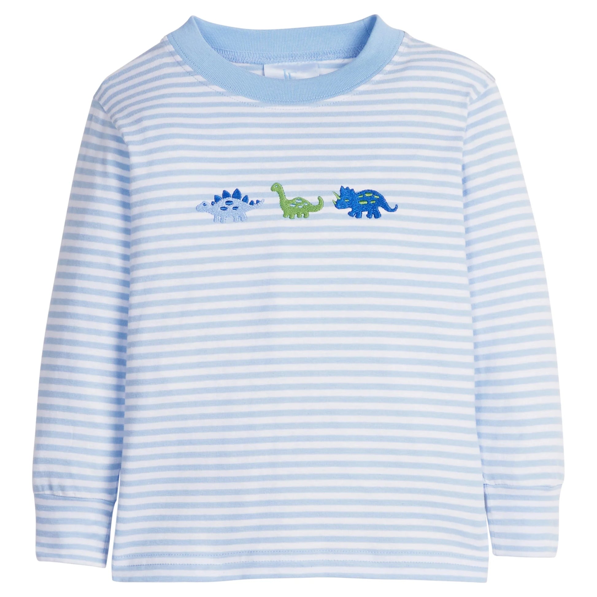 The Dino-mite collection is roarin’ with fun! Made from 100% cotton, this classic long sleeve shirt features light blue and white stripes and three adorable dinosaurs embroidered across the chest. Add our Basic Short in Breeze Blue Twill to complete the look!