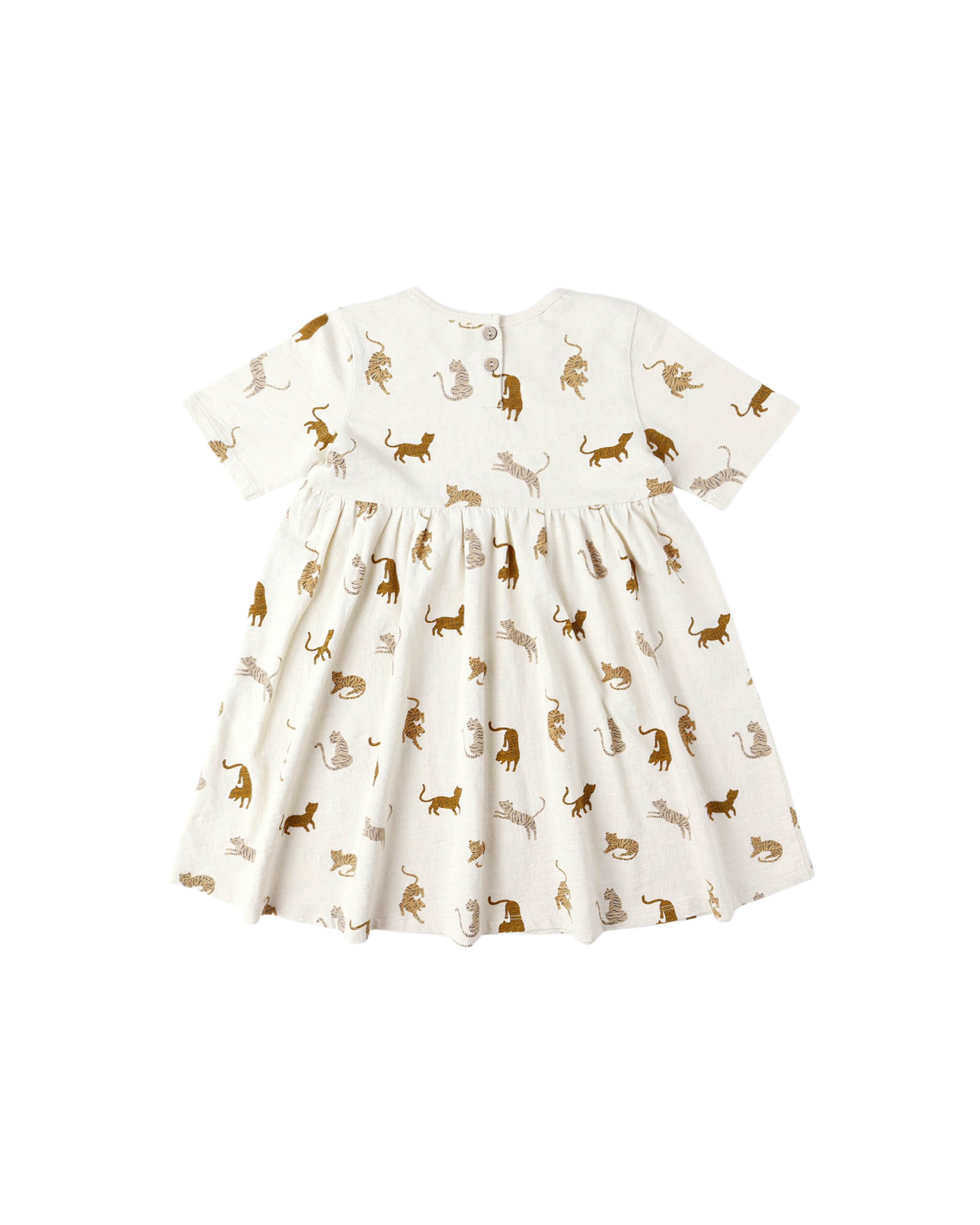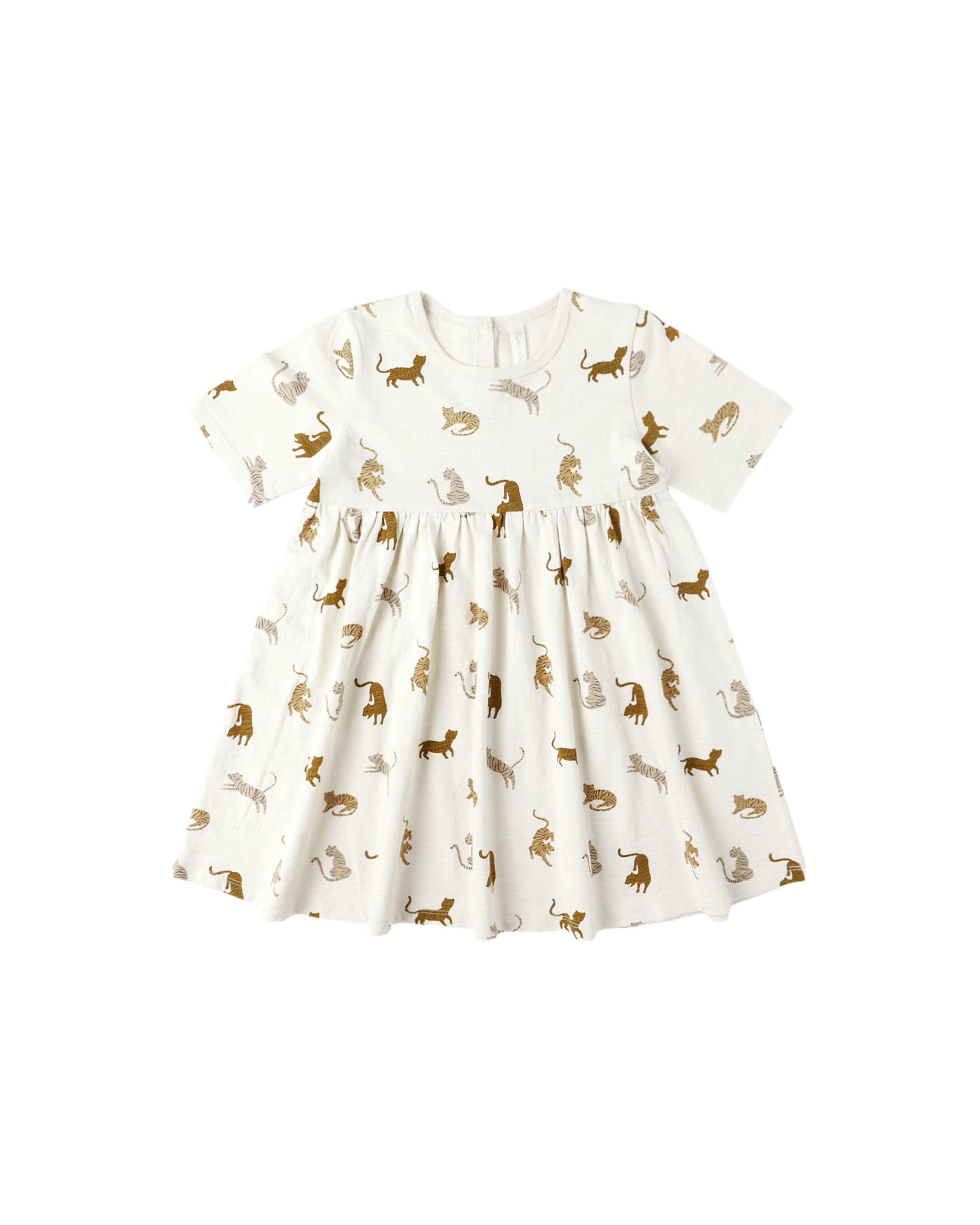 This allover print dress is made from the softest cotton jersey, featuring a gathered skirt + half-length sleeves that reach just above the elbows.