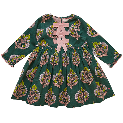 Happy Holly-days! Freshly clipped sprigs of holly tied to vintage ornaments and bells bring Christmas cheer to our party-ready Girls Hermione Dress. This sweet silhouette is adorned with sophisticated black grosgrain ribbon bow accents at the chest, black pearl stitch ruffled trim at the gathered puff sleeve and has an invisible zipper closure at the back. Twin with Baby Sis in our Baby Girls Hermione Bubble.