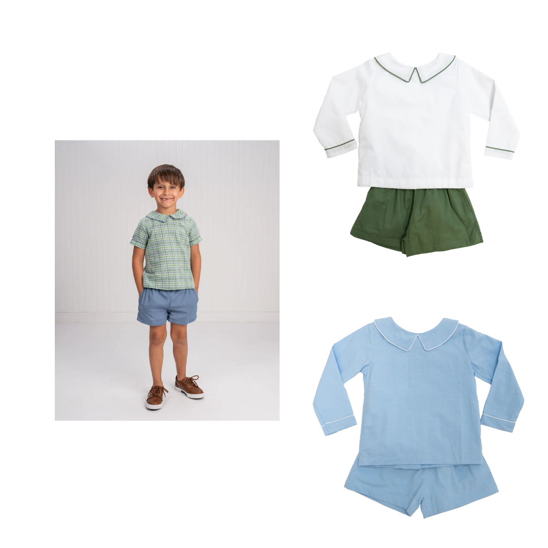 Keep him cool and stylish in the John Bluegrass Plaid Short Set. Featuring a soft bluegrass-inspired plaid, this coordinated set includes a smart short-sleeve shirt and matching shorts — ideal for sunny days, family gatherings, or casual outings. Crafted with breathable fabric and thoughtful details, it’s a go-to for effortless, polished looks.