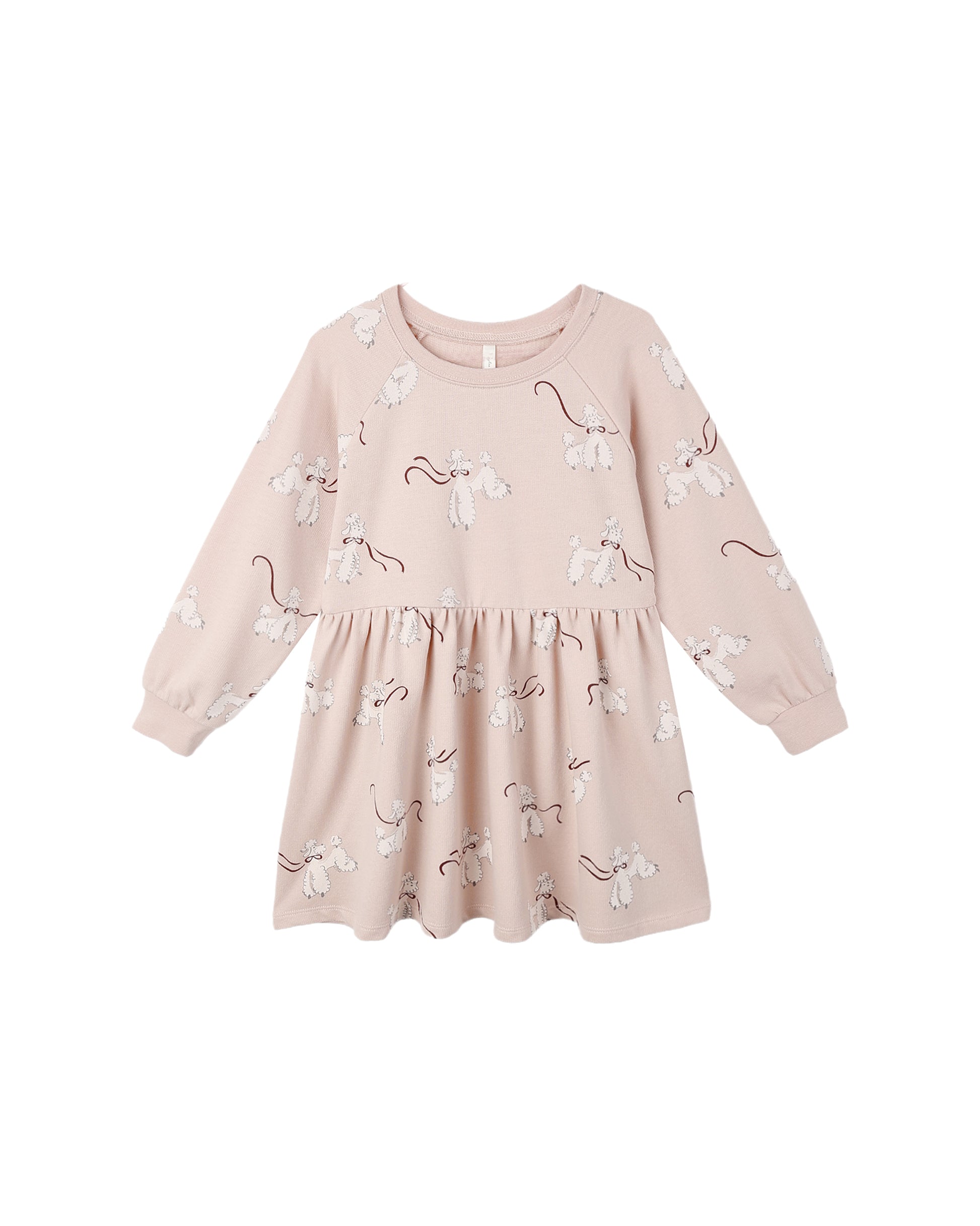 This short sleeve raglan dress is an easy pullover style with ribbed cuffs, and a gathered skirt in a comfy soft-washed french terry fabric.
